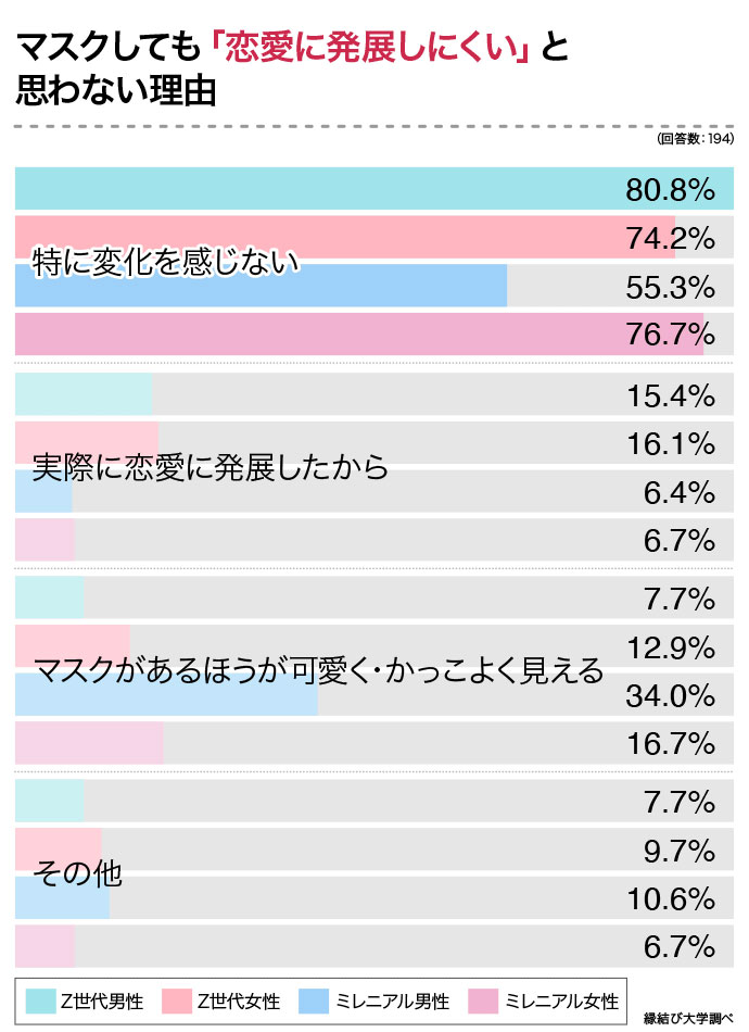 もっとも多かったのは性別・世代を問わず「特に変化を感じない」という理由で、69.4%でした。続いて「マスクがあるほうが相手が可愛く・かっこよく見える」が20.1%、「実際に恋愛に発展したから」が10.4%です。