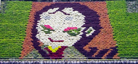▲大勢の市民ボランティアと企業の協力で美しい花のアートが作られる