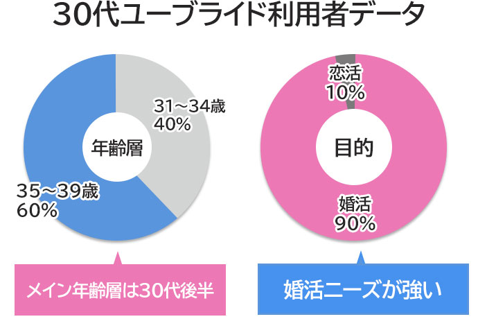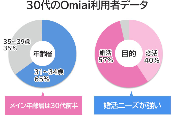 独自調査によると、ペアーズの30代会員の62%が31〜34歳で、恋活を目的とする人が52%、婚活を目的とする人が45%と、ほぼ均等に分かれています。(独自調査のうちペアーズ利用者の30代に絞った結果)