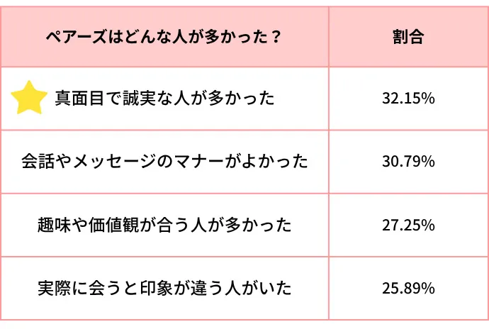 編集部が行ったペアーズ利用者367名に行ったアンケート※でも、「真面目で誠実な人が多かった(32 %)」「会話やメッセージのマナーがよかった(31%)」と評価していました。(※2025年10月/クラウドワークス調査)