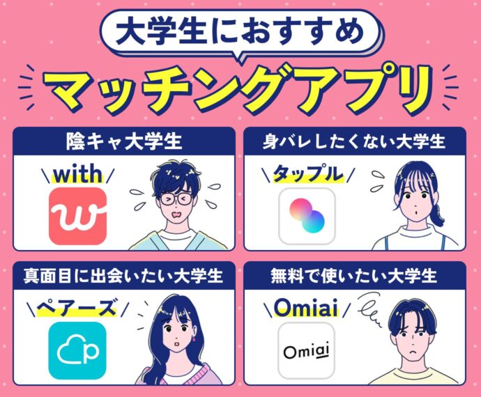 大学生のおすすめのマッチングアプリは以下の4つです。 ・すぐに恋人が欲しい、性格重視の出会いを求めるなら「with」 →20代前半の利用者が多く、性格診断で相性の良い相手を探しやすいです。 ・無料で利用したい男子学生、同年代と気軽に会いたいなら「タップル」 →18〜24歳の利用者が約50%を占め、「おでかけ機能」でスピーディーな出会いが可能です。 ・地方在住で出会いが少ない、色々な人と交流したいなら「ペアーズ」 →累計登録者数2000万人以上と国内最大級で、地方でも出会いのチャンスが多く、コミュニティ機能も充実しています。 ・少し年上の社会人と出会いたい、真剣に将来を見据えた交際をしたいなら「Omiai」 →25歳以上の利用者が多く、真剣度の高いユーザーが集まっています。