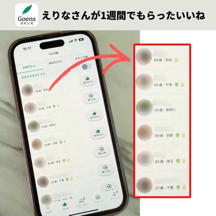 ゴエンズは、同世代との出会いをじっくり育てたい人に向いていると思います。155人ものいいねが届いたことからも、同年代の男性がたくさんいることは確か。婚活中の60代には、これだけの出会いのチャンスがあるアプリはなかなかないと思います。