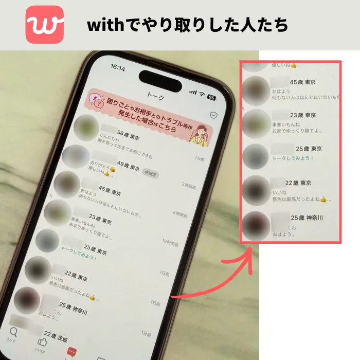 withは写真が綺麗な会員が多い分、女性会員も綺麗な人が多そうで、きっとそっちとメッセージしているんだろうなと(笑)。いいねの数に一喜一憂しすぎないのが精神的に楽です。