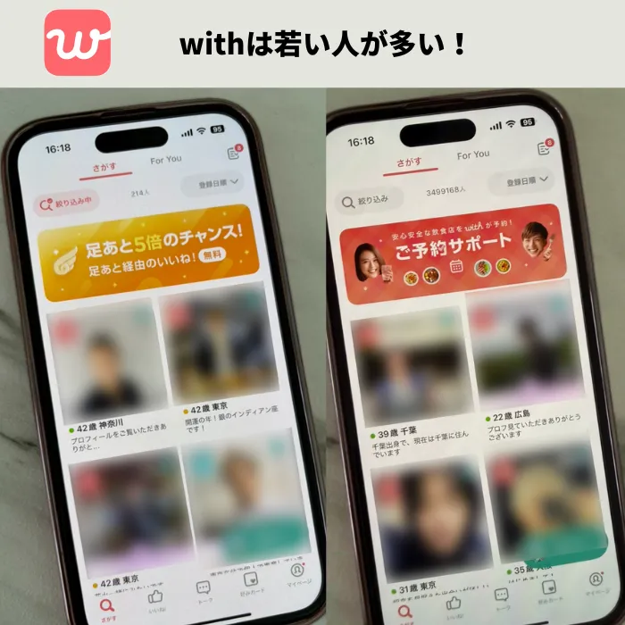 withは、若い世代の話を聞くのが好き・刺激が欲しいという人に向いていると思います。67歳だとマッチングのしにくさは正直あるけれど、プロフィール検索で年齢や条件を絞り込めば50〜60代も出てくるので、最初の設定が肝心です。安全面の仕組みも充実していて、その点は安心して使えました。