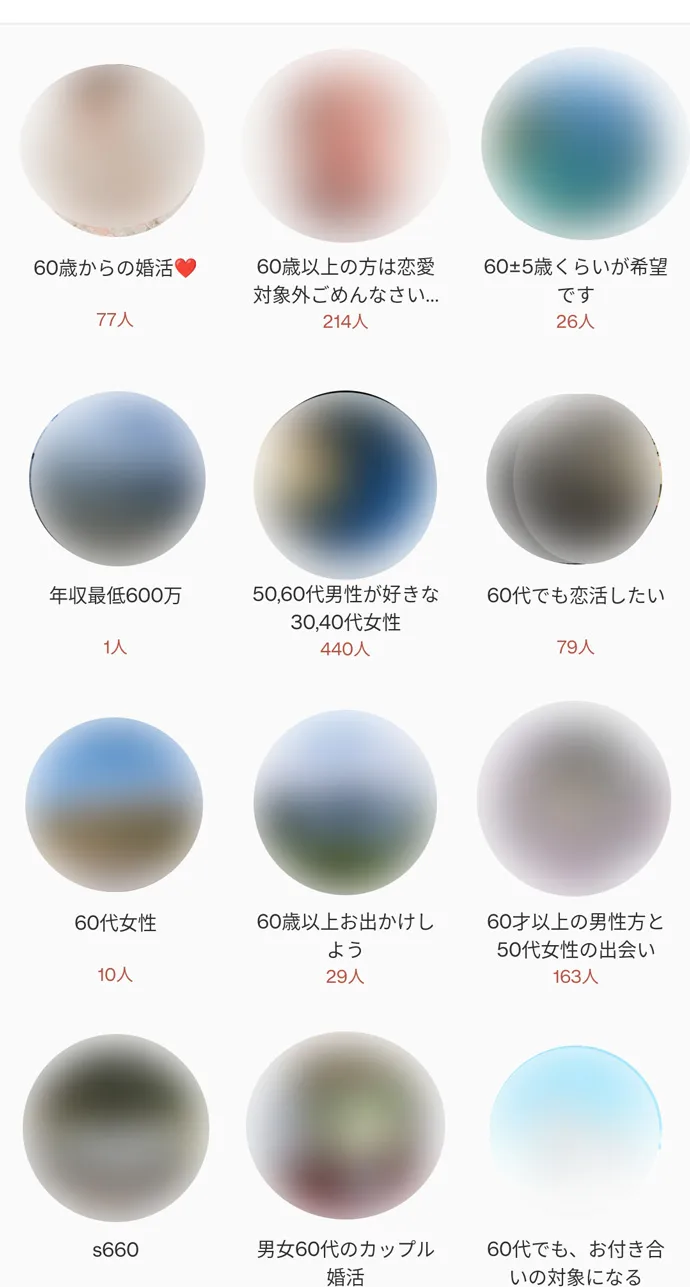 例:60代の恋愛、 お茶友達探し など60代向けグループも充実