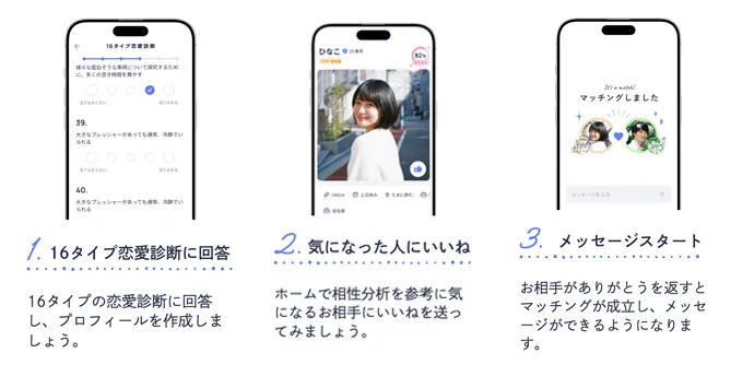 ■コイグラム:価値観重視で相性の合う相手と出会いたい人向け 登録時の50問の恋愛診断で16タイプに分類。価値観の近い相手が見つかりやすいのが強み。男女とも無料でメッセージ可能で、恋愛への“温度感”が揃いやすい。 |