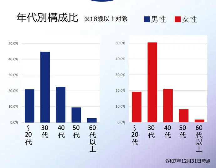 公表されている男女比は、男性63%・女性37%(令和7年12月31日時点)です。