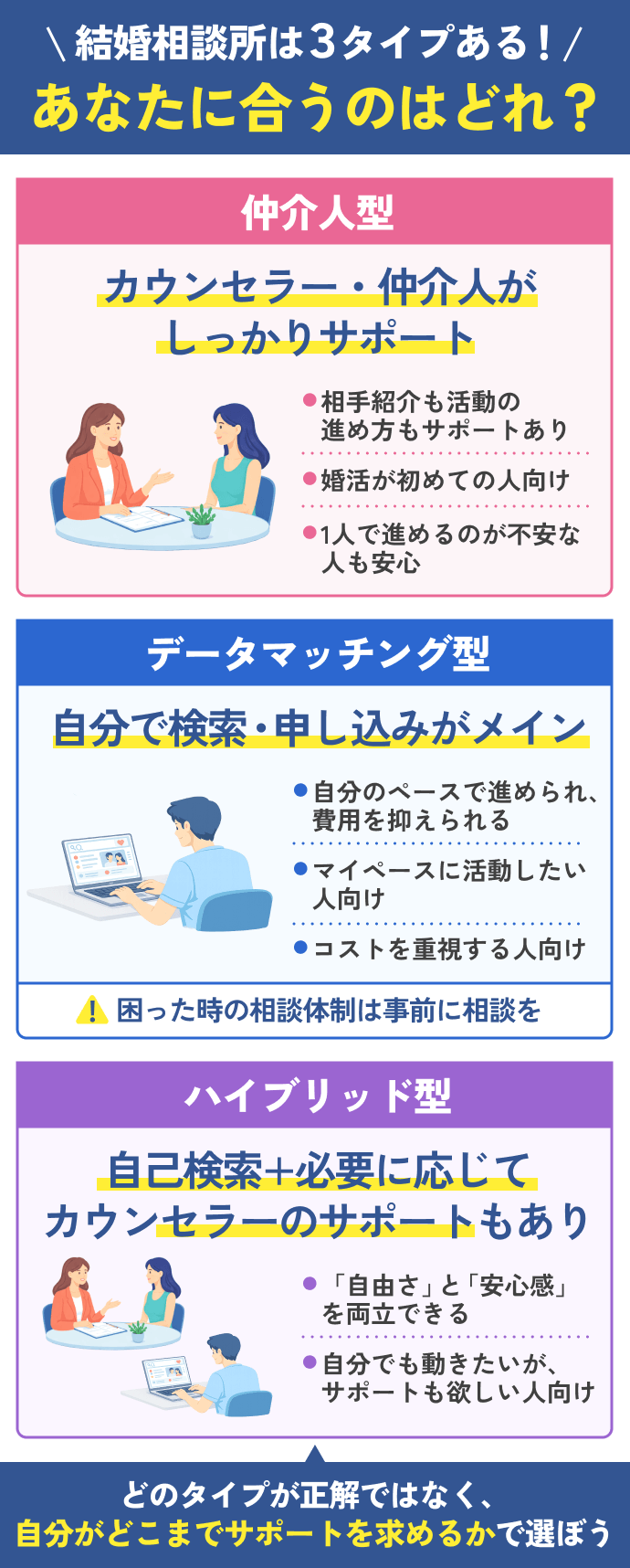 結婚相談所は、真剣度の高い出会いを効率よく探せる心強い選択肢ですが、状況や目的に応じて他の婚活サポートと組み合わせて使うのも有効です。