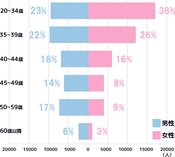 - 女性は20~39歳が多い傾向にあるため、年下女性と結婚したい30歳~44歳の男性におすすめ