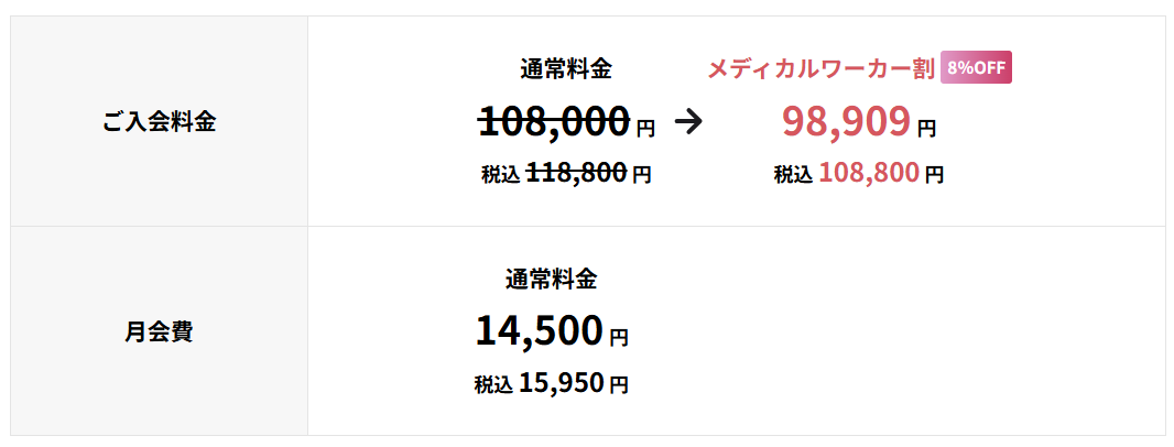 20代の方なら、入会金と月会費が安くなります。入会金は通常118,800円のところが、55,000円と、ほぼ半額になり、月会費も3,850円安い12,100円で利用できます。