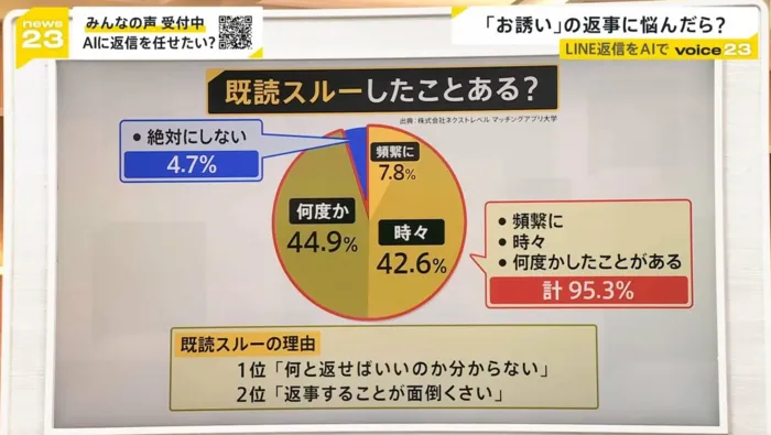 今回の放送では、「LINEアプリ上でAIが返信文を提案してくれる最新サービス」に関する特集が組まれ 、ユーザーの本音や課題感に焦点を当て、当メディアの調査データが「返信が難しいと感じた経験」の裏付けとして紹介されました。